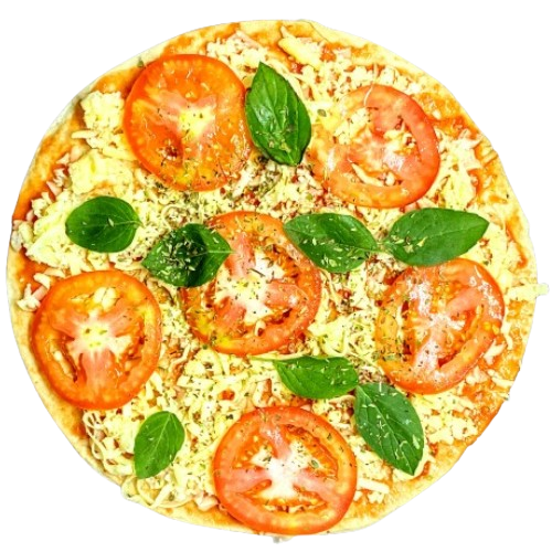 Molho de tomate artesanal, muçarela, tomate e manjericão