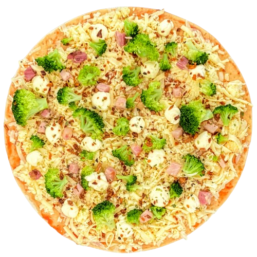 Molho de tomate artesanal, muçarela, brócolis, catupiry, bacon e alho frito artesanal.