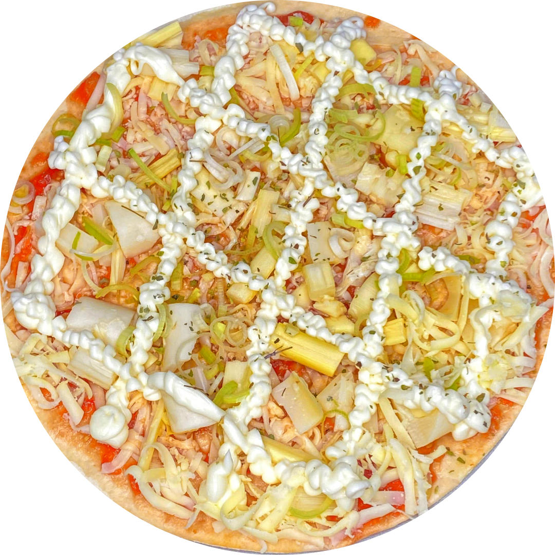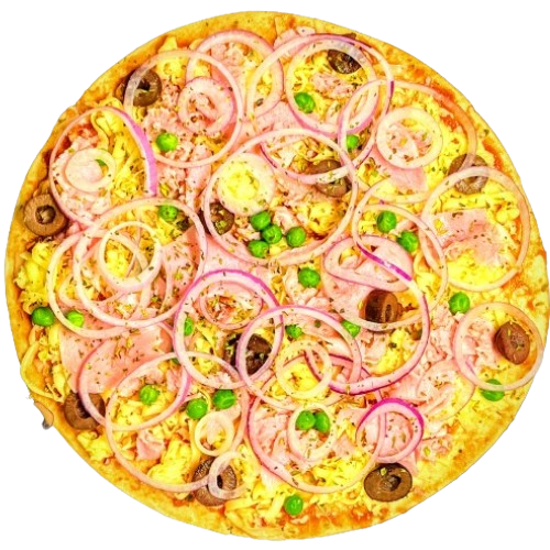 Molho de tomate artesanal, muçarela, presunto sadia, cebola roxa, ervilhas frescas e azeitonas pretas.