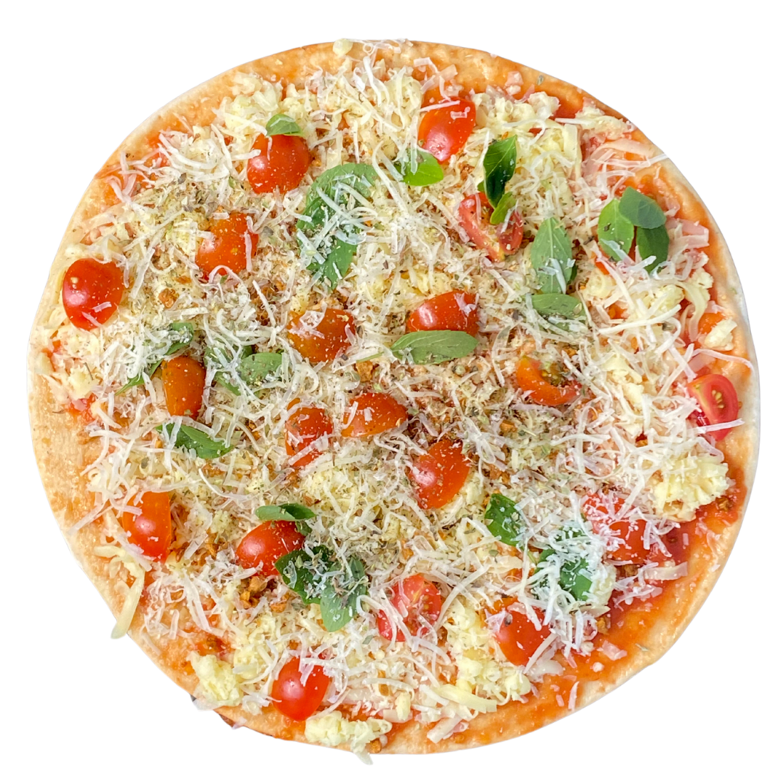 Molho de tomate artesanal, muçarela, tomate cereja, manjericão e parmesão.