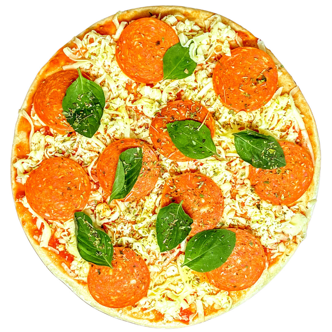 Molho de tomate artesanal, muçarela, pepperoni e manjericão.