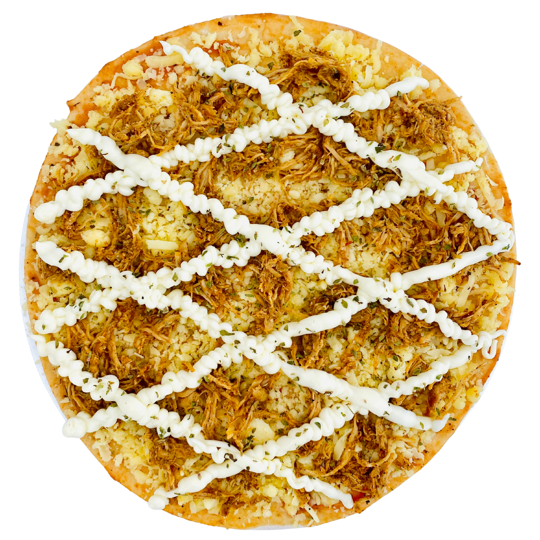 Molho de tomate artesanal, muçarela, frango de panela desfiado e catupiry.
