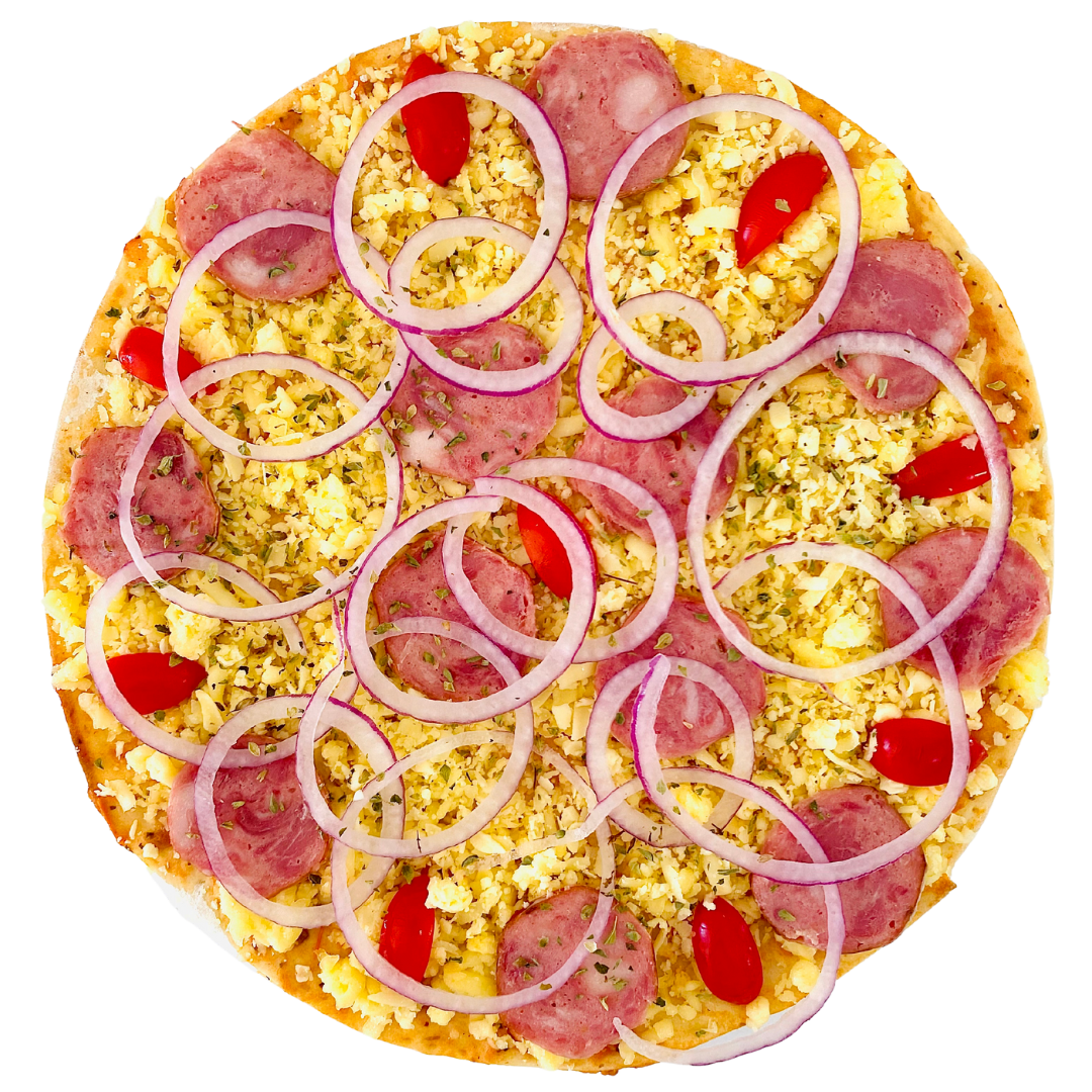Molho de tomate artesanal, muçarela, calabresa ceratti, cebola roxa e tomate cereja.